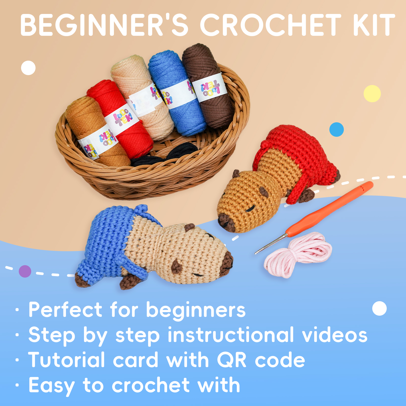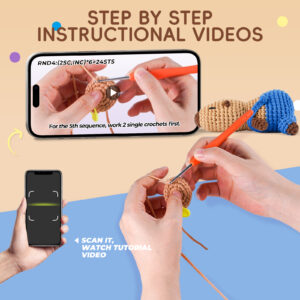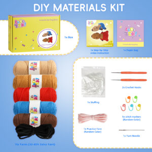 Includes everything you need: an ergonomic crochet hook, soft beginner-friendly yarn, stitch markers, safety eyes, a blunt needle, stuffing, plus detailed PDF and video tutorials—no extra supplies needed!